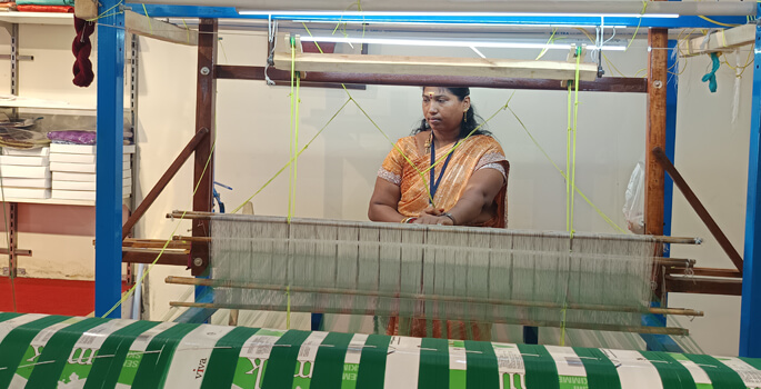 Students gain hands-on experience in warp preparation, weft techniques, color theory, motif creation, and jacquard pattern development. Alongside practical weaving skills, learners are trained in digital textile design, enabling them to translate traditional art into innovative, market-ready fashion products.